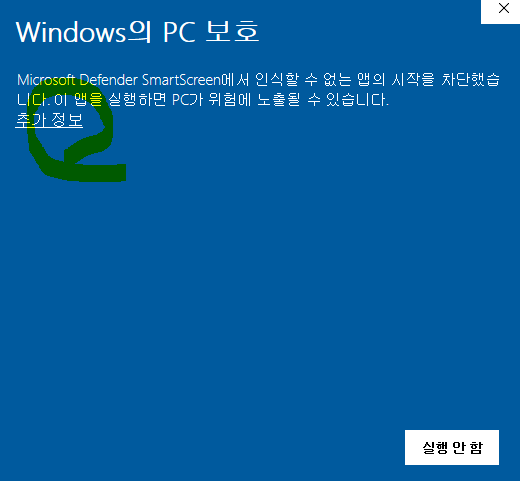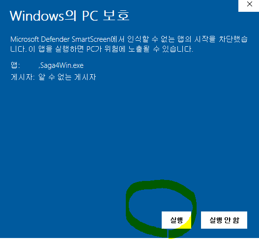 Saga4 win을 실행하시면 위에 같은 블루색 화면이 뜨는데 추가 정보 누르면 아래에 실행이 활성화되니 클릭하면 실행됩니다.